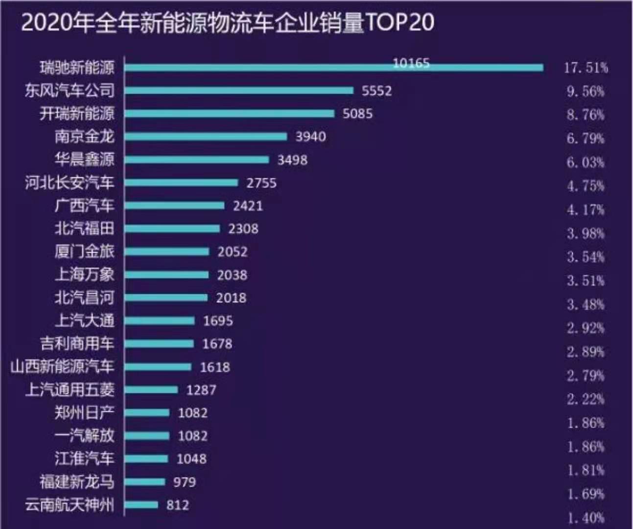具體來(lái)看,2020年全年的新能源物流車銷量冠軍得主是瑞馳新能源,銷量幾乎是亞季軍之和。此外,它也是全國(guó)97個(gè)新能源物流車企業(yè)中唯一一家銷量過萬(wàn)的企業(yè),累計(jì)銷量為10165輛,市占比17.51%,遙遙領(lǐng)先于其他新能源物流車企業(yè)。