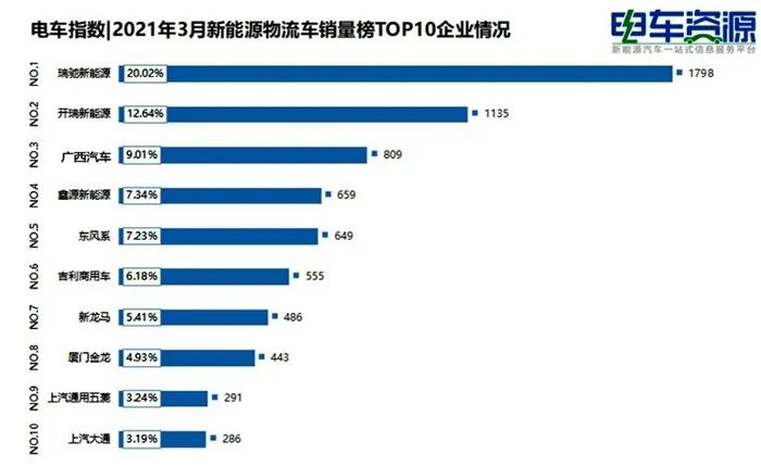 2021年3月,瑞馳新能源以1798輛的銷售成績繼續(xù)保持榜首位置,市場占比超過20%。其主力車型瑞馳EC35II同樣是3月車型的銷量冠軍,在67座城市有銷量數(shù)據(jù),超過百臺的城市有深圳、廣州、上海、蘇州和成都。此外,瑞馳EC31銷量突破200臺,主要銷售城市為重慶、成都和珠海。